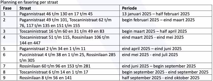 De werkzaamheden beginnen op 13 januari 2025 en duren tot eind oktober 2025. De werkzaamheden bestaan uit 9 delen (fases). Dit doen we om overlast zoveel mogelijk te beperken. Zie het planningskaartje in de bijlage van deze brief.